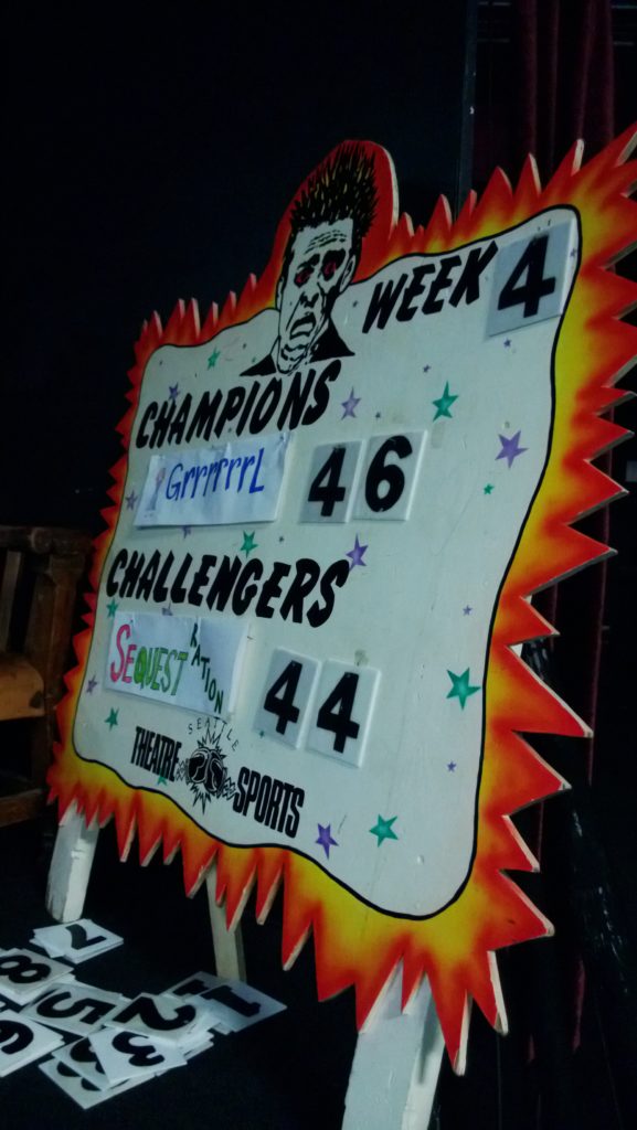 In the TheatreSports ensemble, we email in our availability on a weekly basis, and don’t know who we’ll be paired with on any given week until the schedule goes out. The only sure way to play with the same people week after week is to win. We play “King of the Hill” – the winning team gets to come back the following week as long as at least half of the players are able to return.